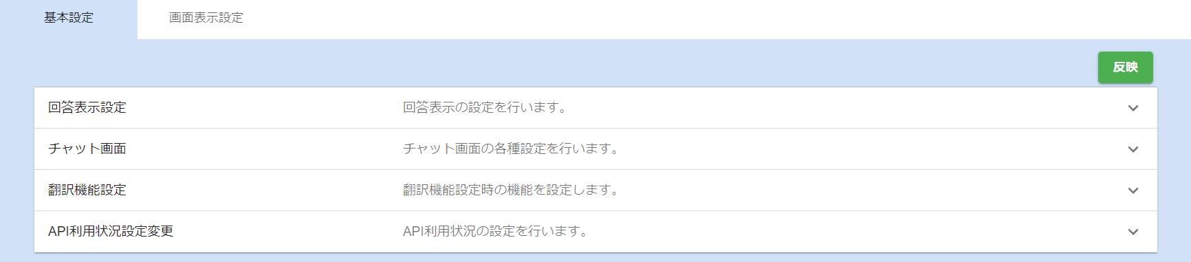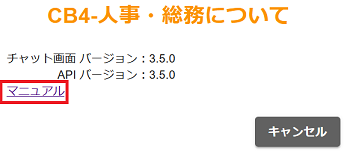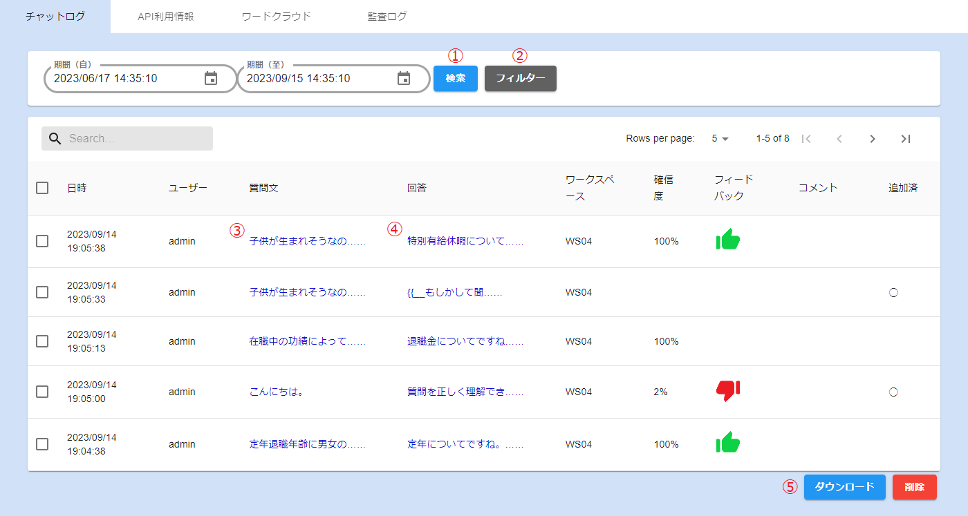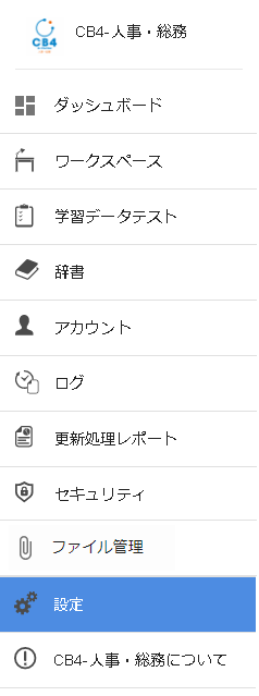 ![]() | ダッシュボード:ダッシュボードで利用状況の参照ができます。 ワークスペース:ワークスペースの作成や削除を行います。 学習データテスト:チャットボットの回答精度を確認するテストを行います。 辞書:同義語・名詞辞書の作成・削除を行います。 アカウント:学習データを管理するアカウントの管理を行います。 ログ:チャットログ(ユーザーとチャットボットの会話のログ)等の参照や削除を行います。 更新処理レポート:処理時間のかかる操作(インポート等)の動作結果の表示を行います。 セキュリティ:アクセス制御を設定します。 ファイル管理:外部ファイルの管理を行います。 設定:回答のしきい値の変更や、画面デザインのカスタマイズなどが行えます。 CB4-人事・総務について:チャット画面・管理画面・APIサーバのバージョンやマニュアルサイトへのリンクを表示します。 ※アカウント・セキュリティ・設定は管理者のみ表示されます。 |