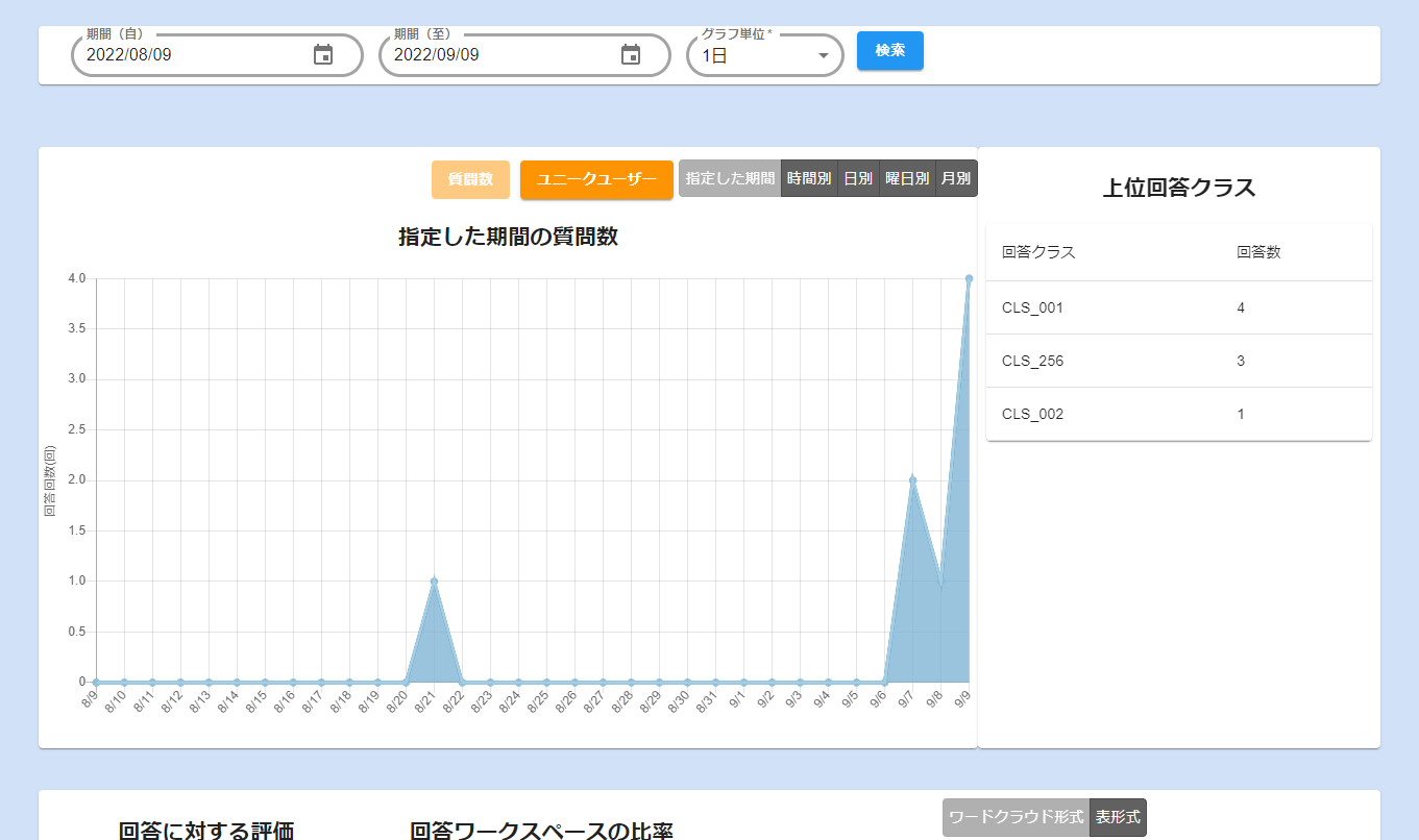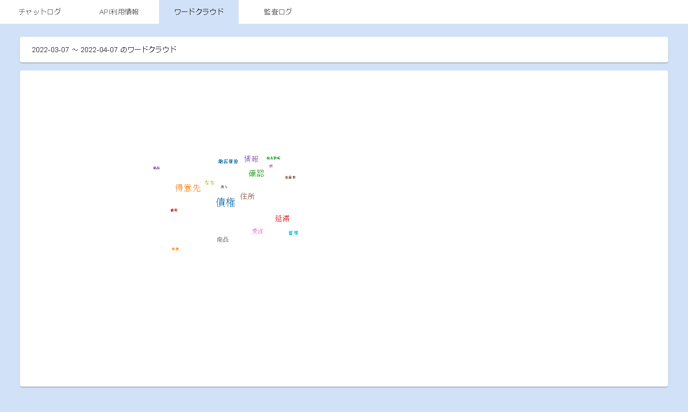 指定した期間内に質問された質問文をもとにワードクラウドを作成、表示します。