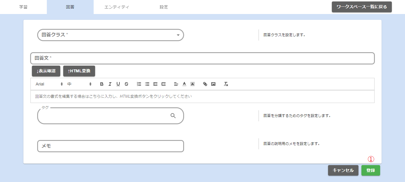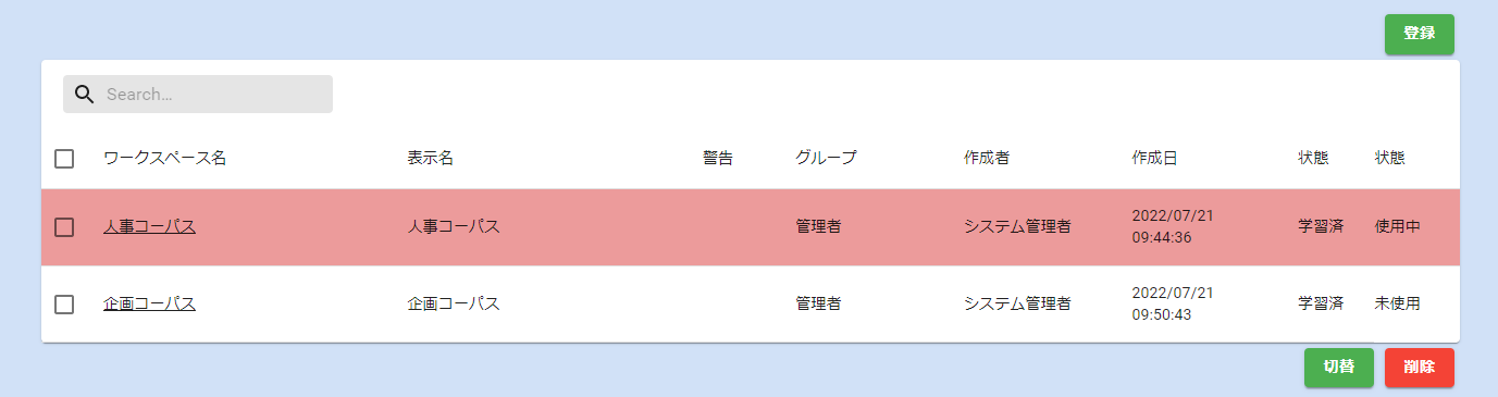 コーパス学習データと回答データを1セットにし1ワークスペースとして登録・管理します。