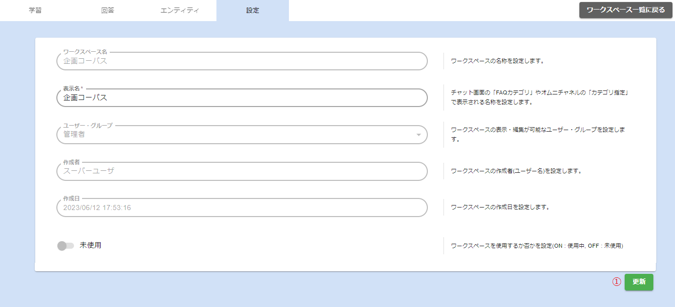 コーパス学習データと回答データのセットを登録するワークスペースを新規に作成することができます。