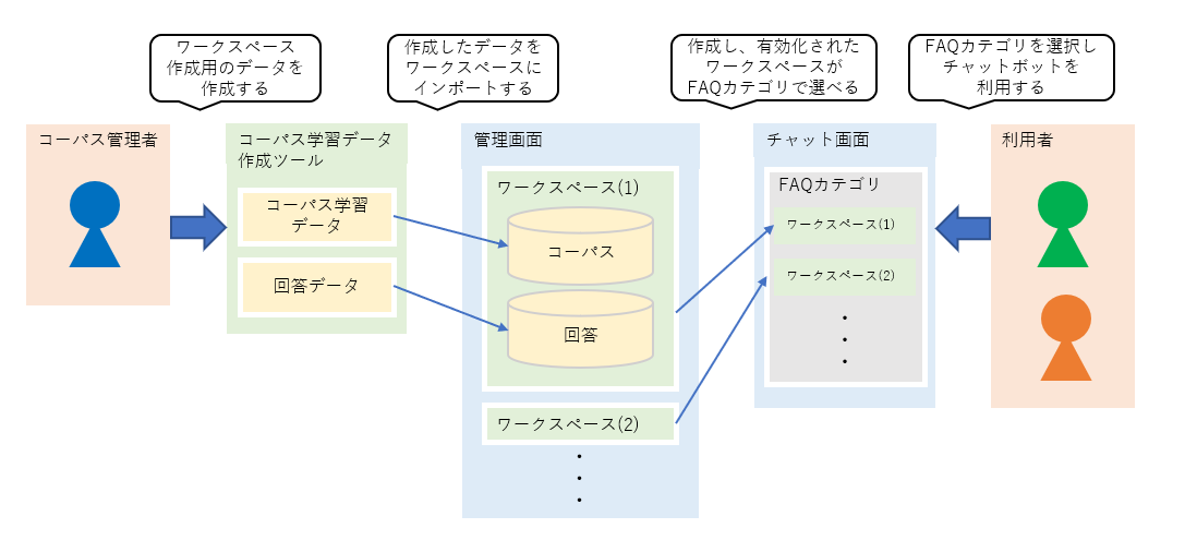 また、コーパス学習データ、回答データはその状態により呼び名が変わります、本説明書では下記の図に沿った形で記載を行っています。