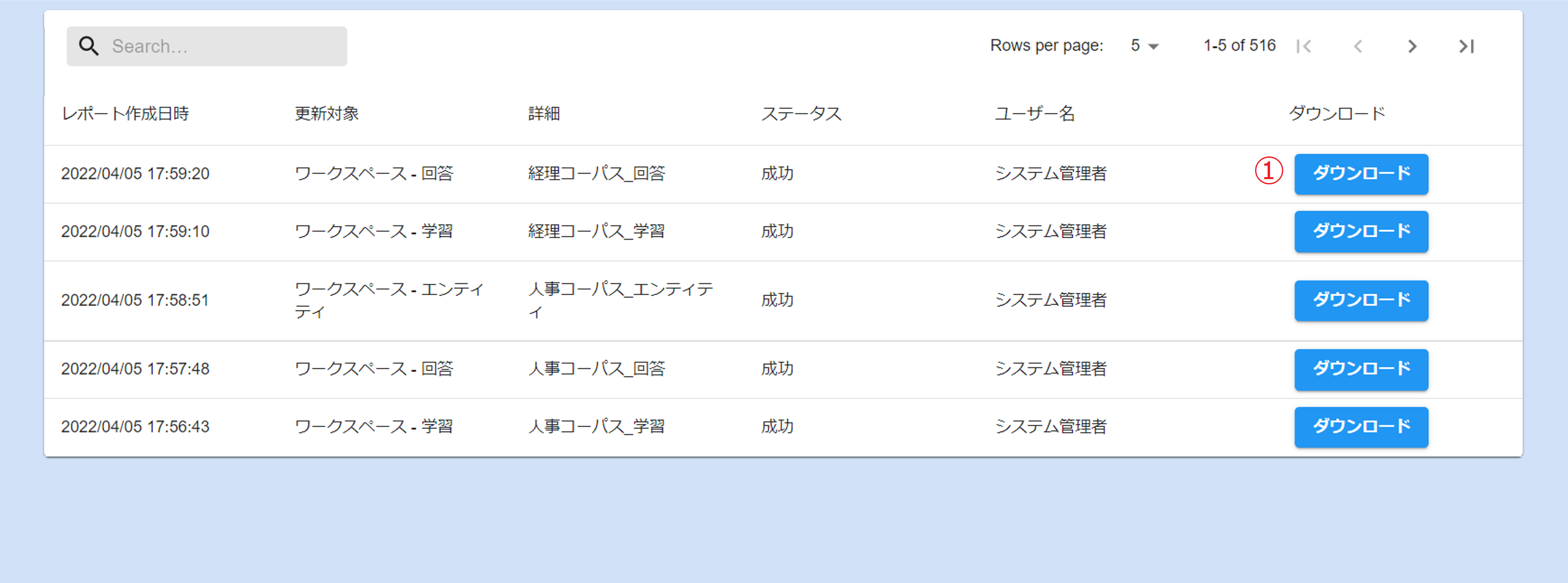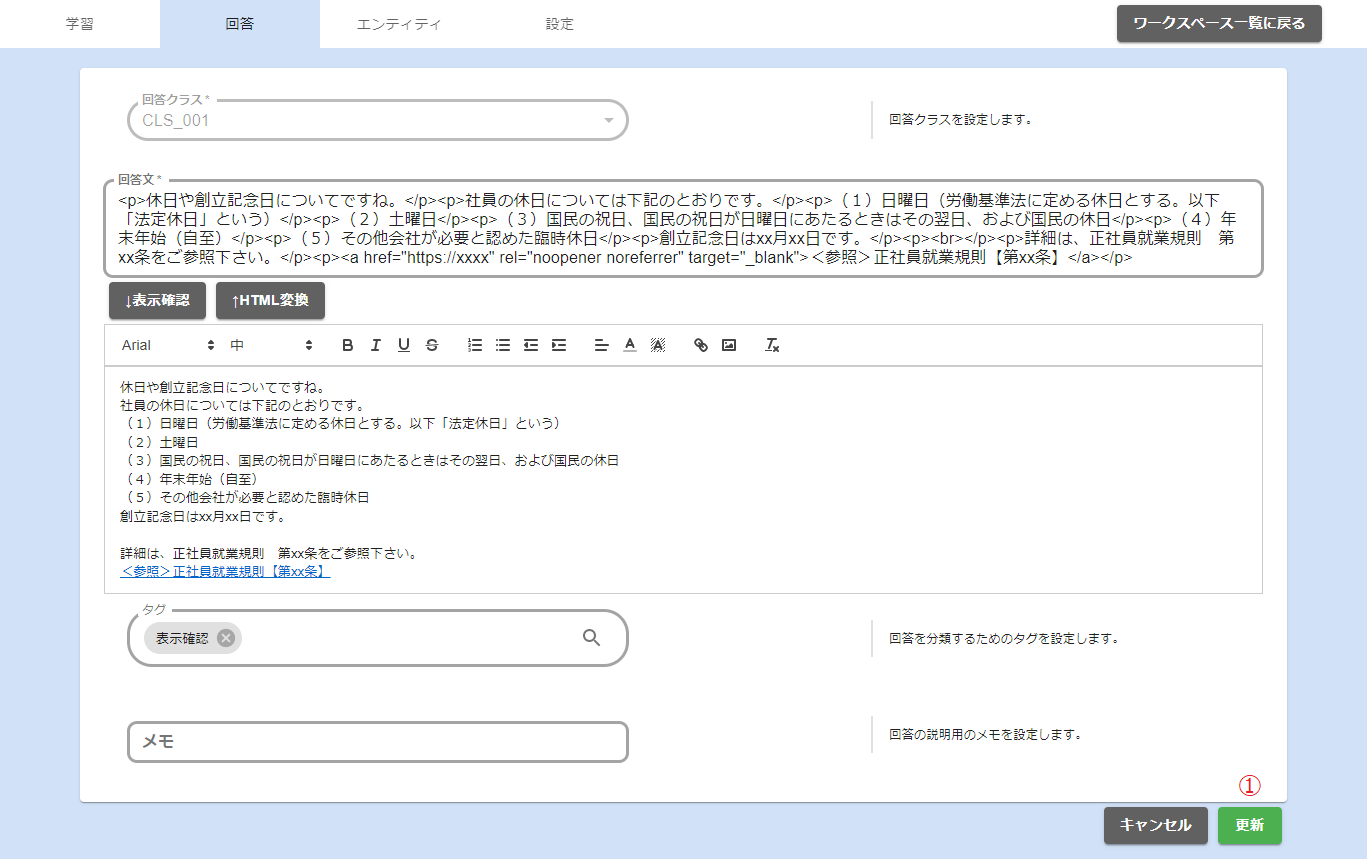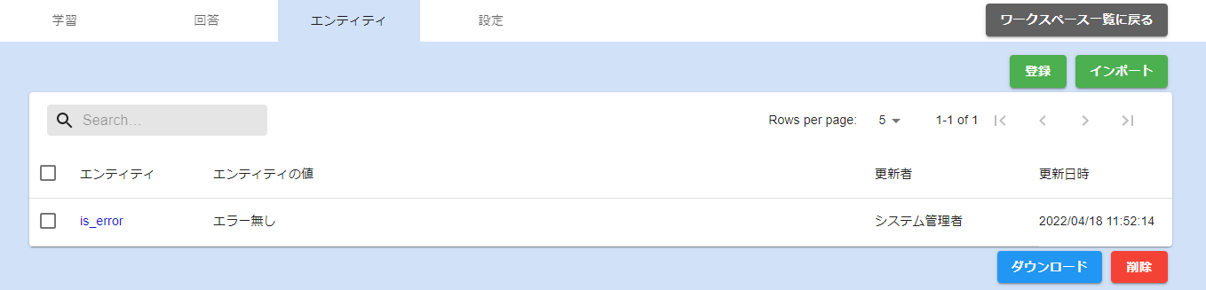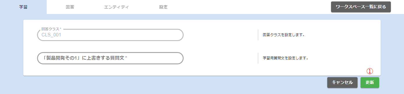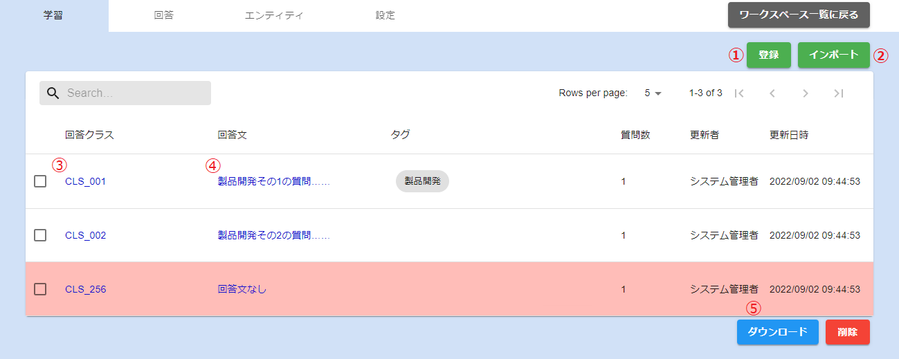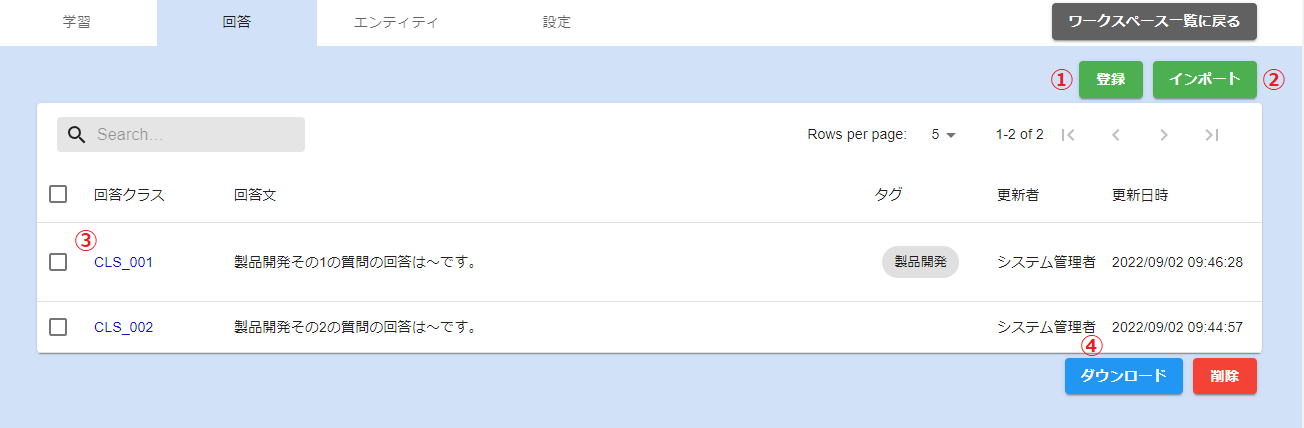 また、選択したワークスペース内のコーパス学習データと回答データの登録や更新、削除、参照が行えます。
