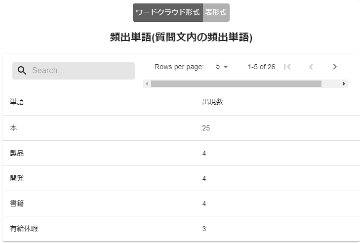 表形式ボタンをクリックする事で、各ワードが使われた回数を表示します。