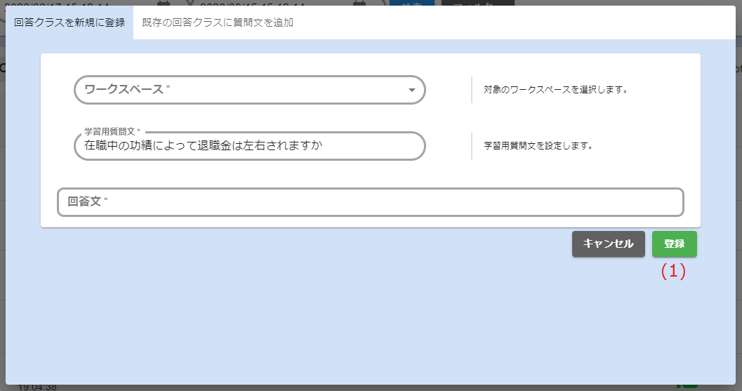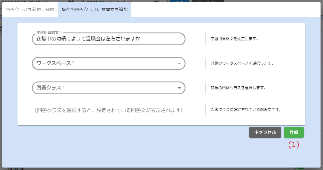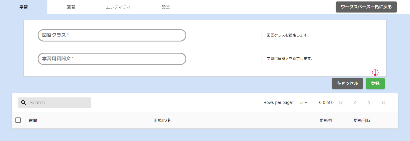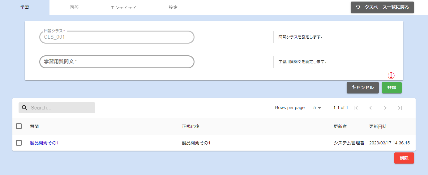 学習データ登録画面を表示し、新規に回答クラスおよび質問文を登録できます。
