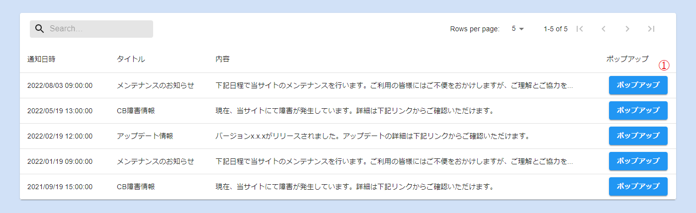 現在または過去にポップアップ表示された通知の一覧を表示し、通知日時や通知内容の参照を行うことができます。