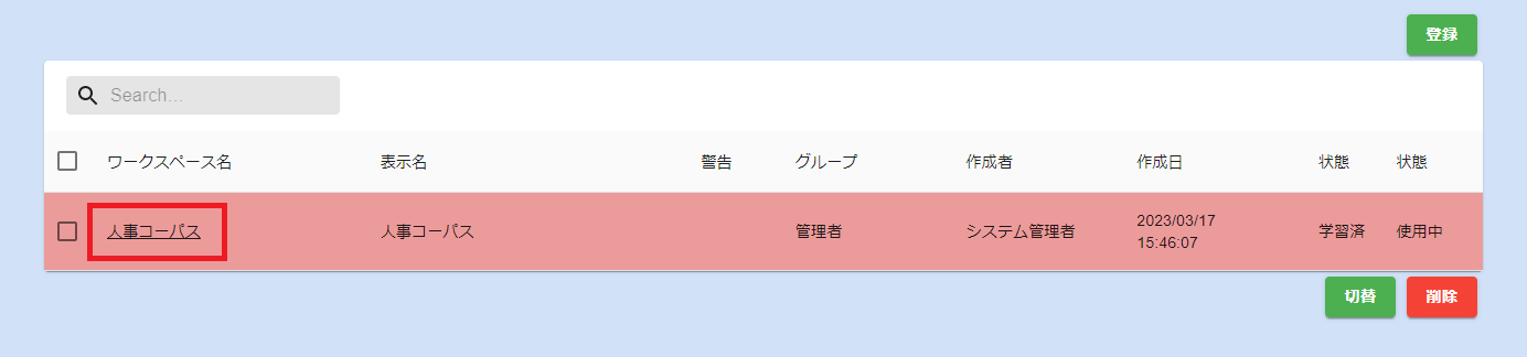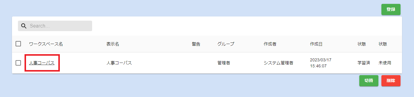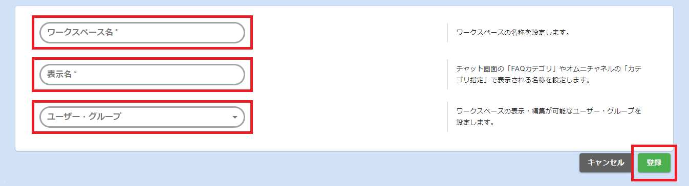 ワークスペース一覧画面で登録ボタンをクリックします。