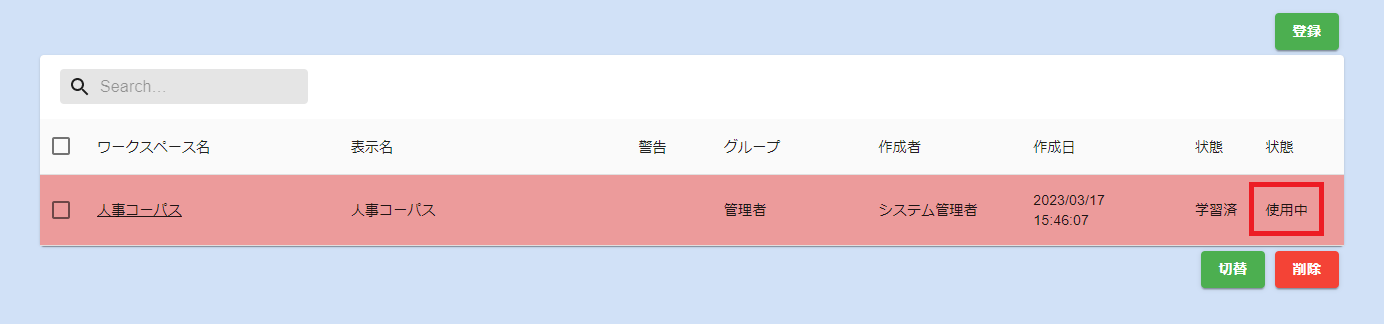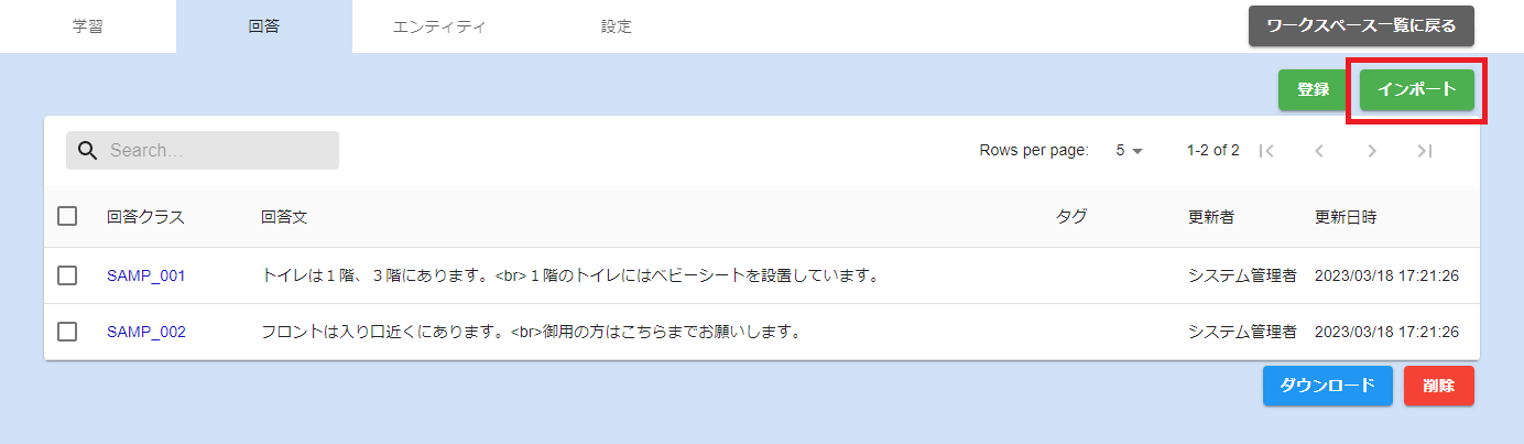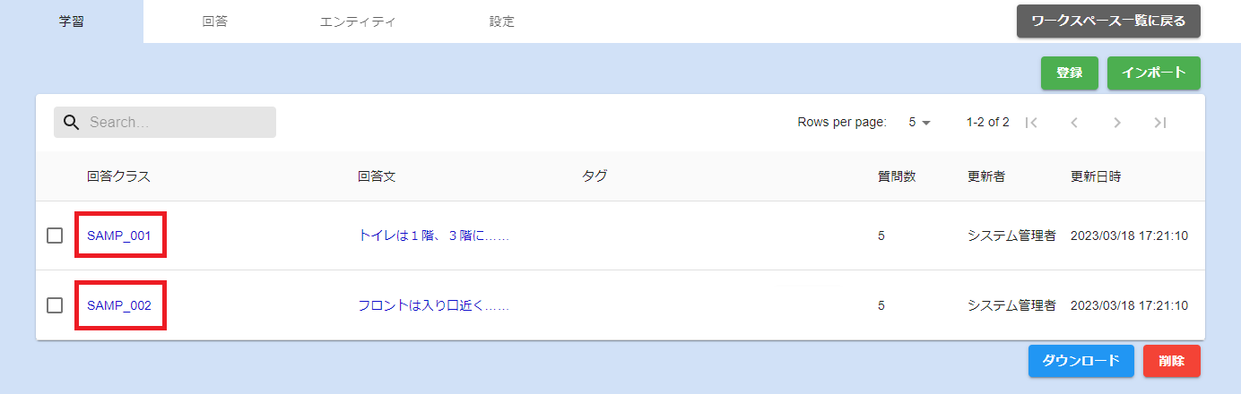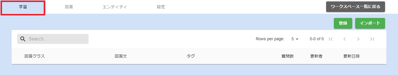 ※ワークスペースの状態が「学習済」、回答データ登録作業の「完了」をもって、新しい学習データが使用可能となります。