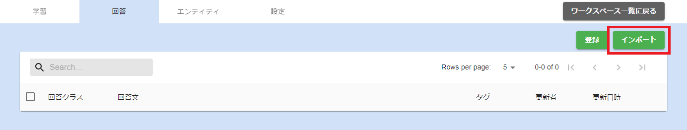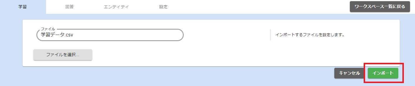 回答データインポート画面にて、再学習データの作成で作成した回答データを選択します。