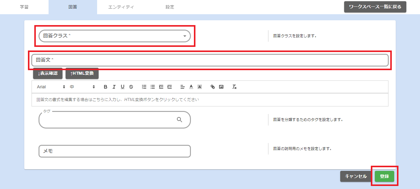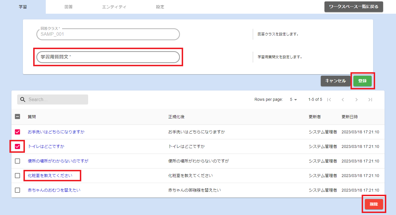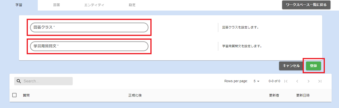 学習用質問文入力欄に登録したい質問文を入力した後、登録ボタンをクリックします。 - 学習データの更新