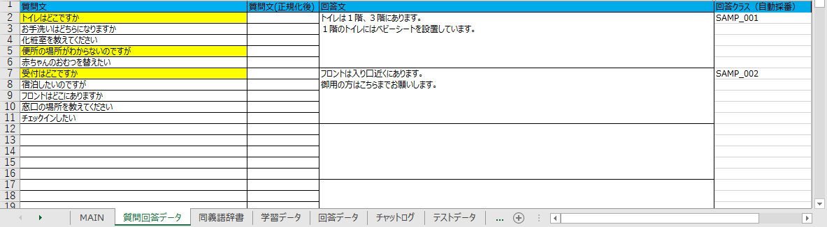 - コーパス学習データ作成ツール「質問回答データ」シートに、質問文、回答文を記載します。