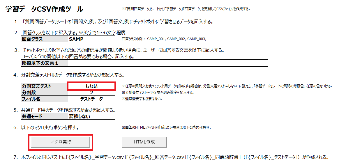 コーパス学習データ作成ツールの「MAIN」シートの学習データCSV作成ツールのマクロ実行ボタンをクリックし、CSVファイルを出力します。