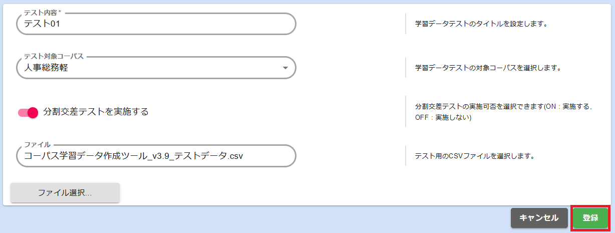 学習データインポート画面にて、ファイル選択をクリックして再学習データの作成で作成したコーパス学習データを選択します。
