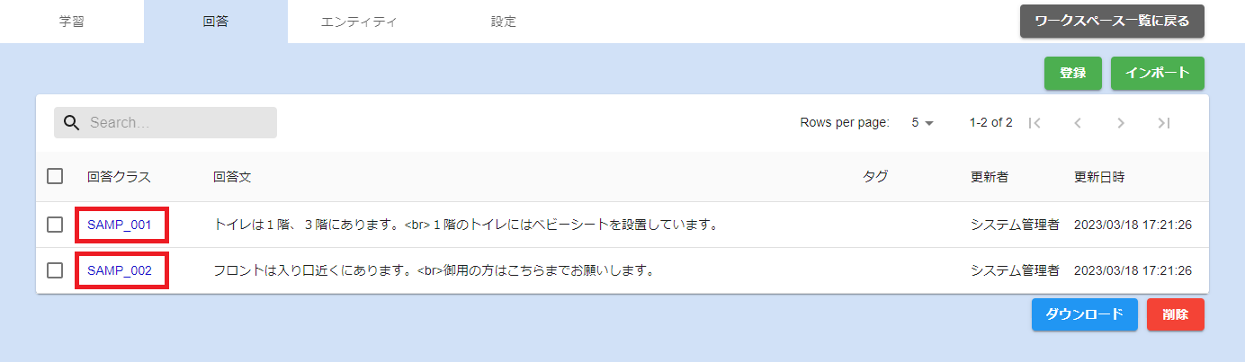 学習データ一覧画面にて、修正する回答クラスをクリックし、登録画面を表示します。